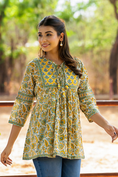 Teal Yellow Buti Flare Short Kurta