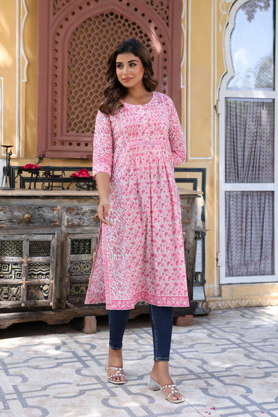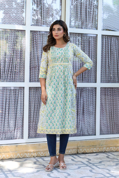 Green Yellow Buti Floral Pintucks Panel Kurti