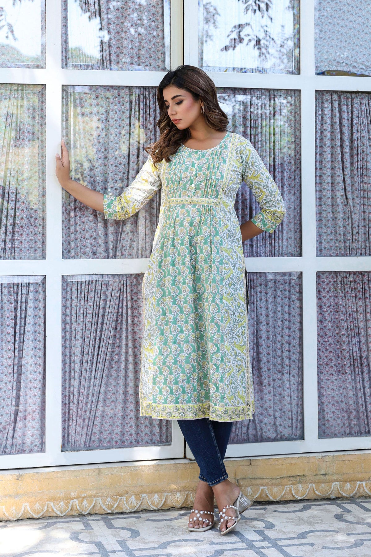 Green Yellow Buti Floral Pintucks Panel Kurti
