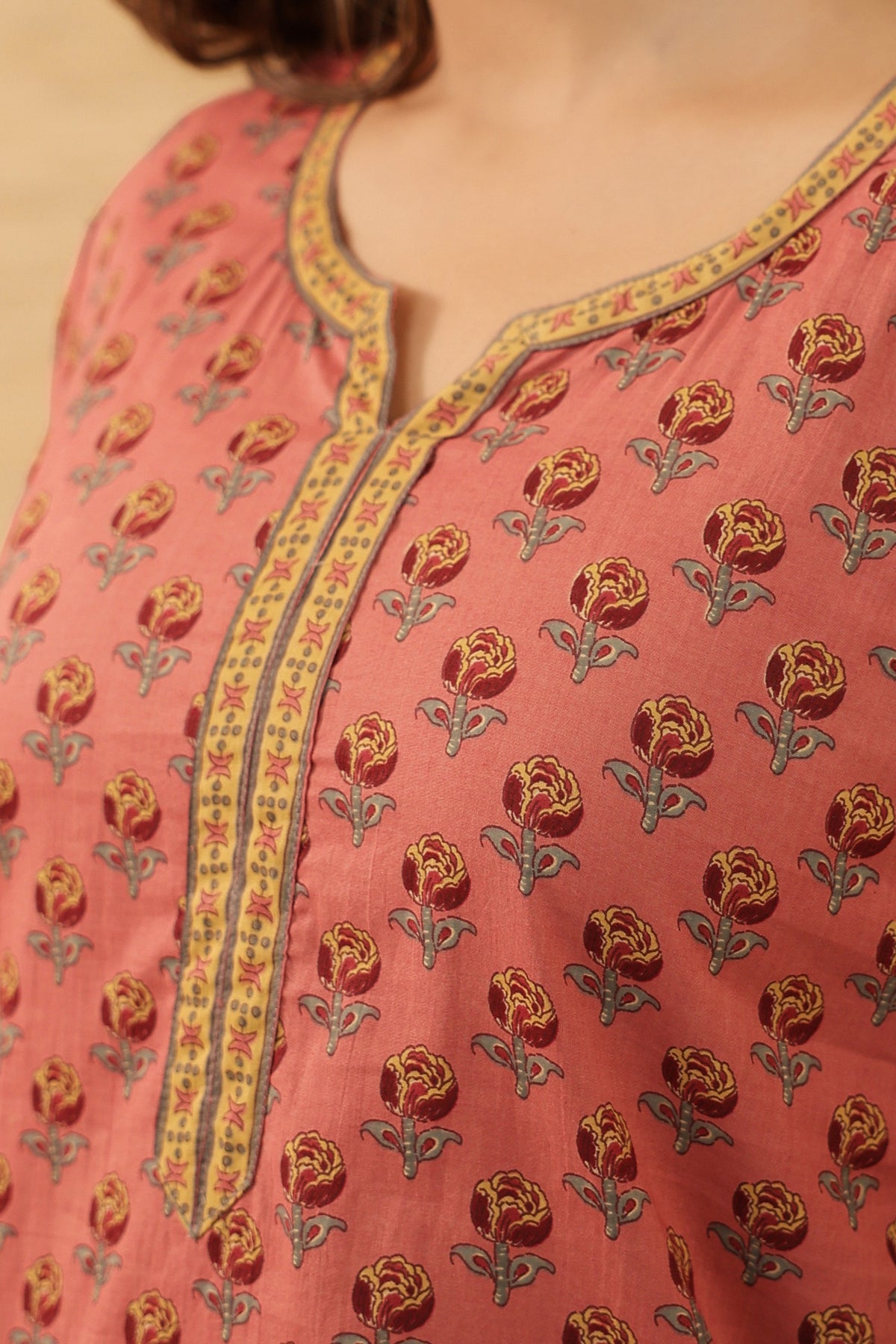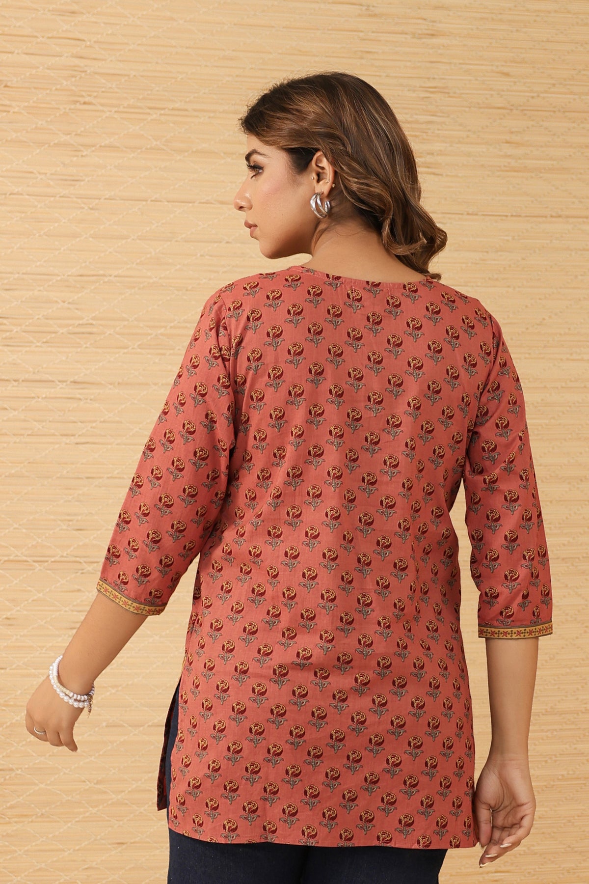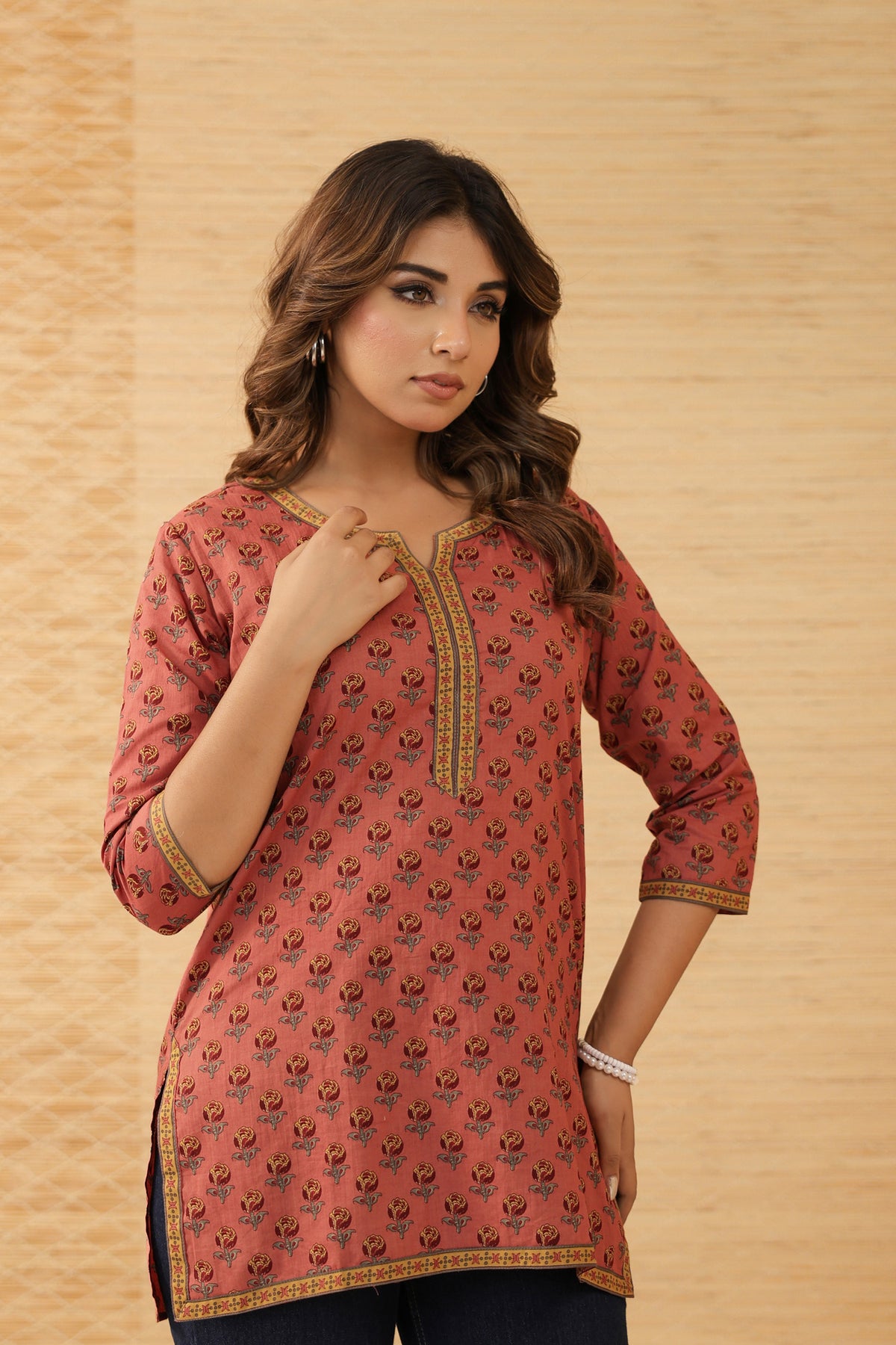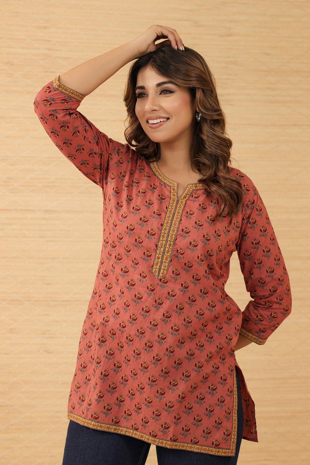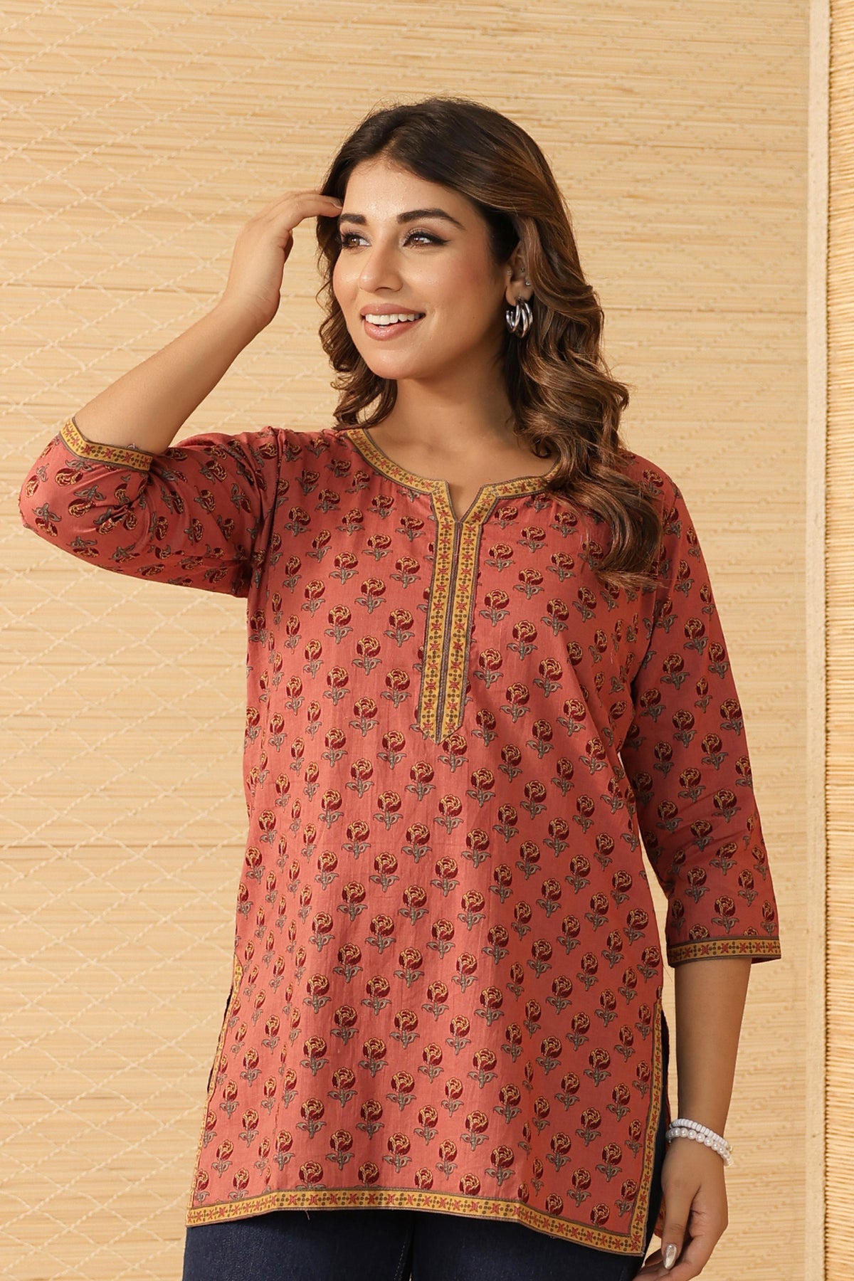 Description: Made in soft breathable cotton fabric, this short kurta is perfect for office wear, home wear, or any type of occasion. Hand block printed in all the natural earthy colors.