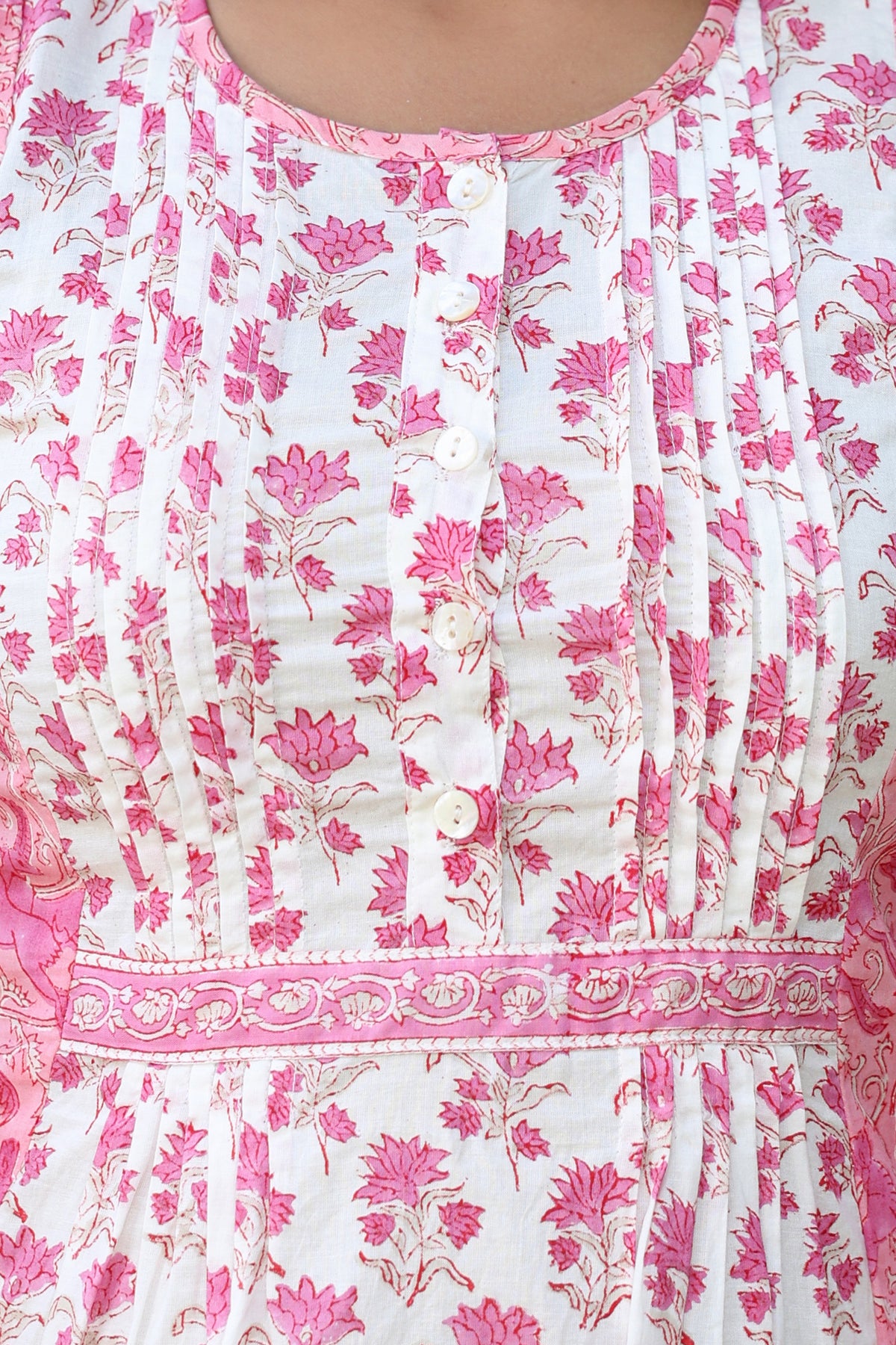 White Pink Floral Pintucks Panel Short Kurti